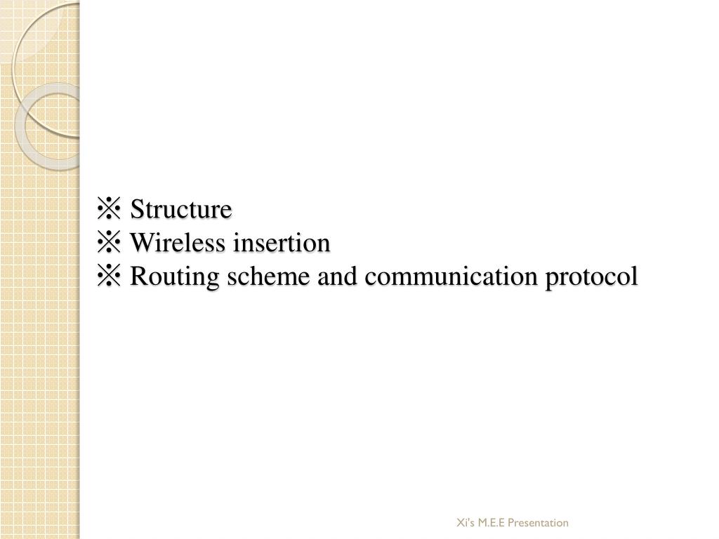 ※ Structure※ Wireless insertion※ Routing scheme and communication protocol Xi's M.E.E Presentation