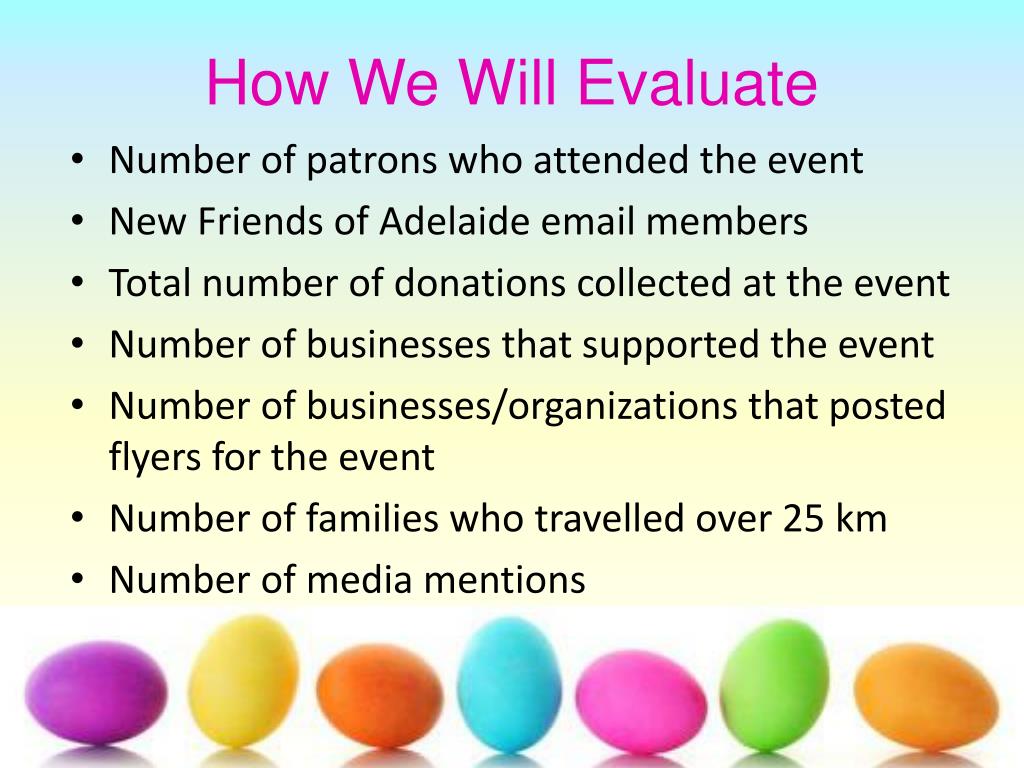 How We Will Evaluate • Number of patrons who attended the event • New Friends of Adelaide email members • Total number of donations collected at the event • Number of businesses that supported the event • Number of businesses/organizations that posted flyers for the event • Number of families who travelled over 25 km • Number of media mentions