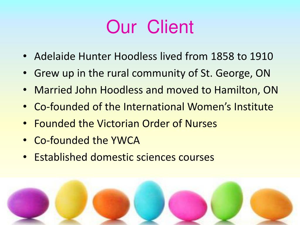 Adelaide Hunter Hoodless Homestead . Easter Egg Hunt 2013 . Our Client. Adelaide Hunter Hoodless lived from 1858 to 1910 Grew up in the rural community of St. George, ON Married John Hoodless and moved to Hamilton, ON Co-founded of the International Women’s Institute