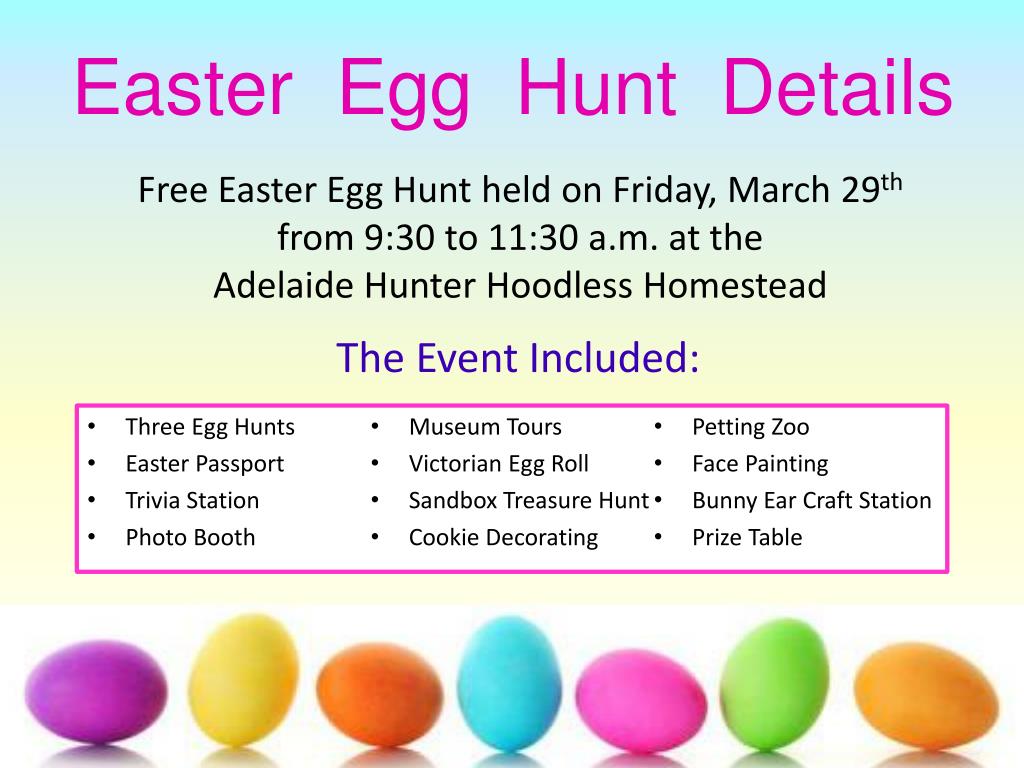 Easter Egg Hunt Details Free Easter Egg Hunt held on Friday, March 29th from 9:30 to 11:30 a.m. at the Adelaide Hunter Hoodless Homestead • Three Egg Hunts • Easter Passport • Trivia Station • Photo Booth • Museum Tours • Victorian Egg Roll • Sandbox Treasure Hunt • Cookie Decorating • Petting Zoo • Face Painting • Bunny Ear Craft Station • Prize Table The Event Included:
