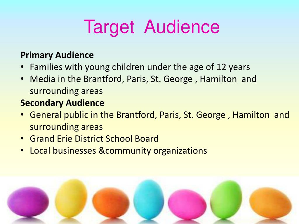 Target Audience • Primary Audience • Families with young children under the age of 12 years • Media in the Brantford, Paris, St. George , Hamilton and surrounding areas • Secondary Audience • General public in the Brantford, Paris, St. George , Hamilton and surrounding areas • Grand Erie District School Board • Local businesses &community organizations
