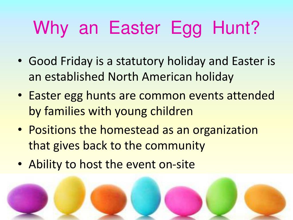 Why an Easter Egg Hunt? • Good Friday is a statutory holiday and Easter is an established North American holiday • Easter egg hunts are common events attended by families with young children • Positions the homestead as an organization that gives back to the community • Ability to host the event on-site