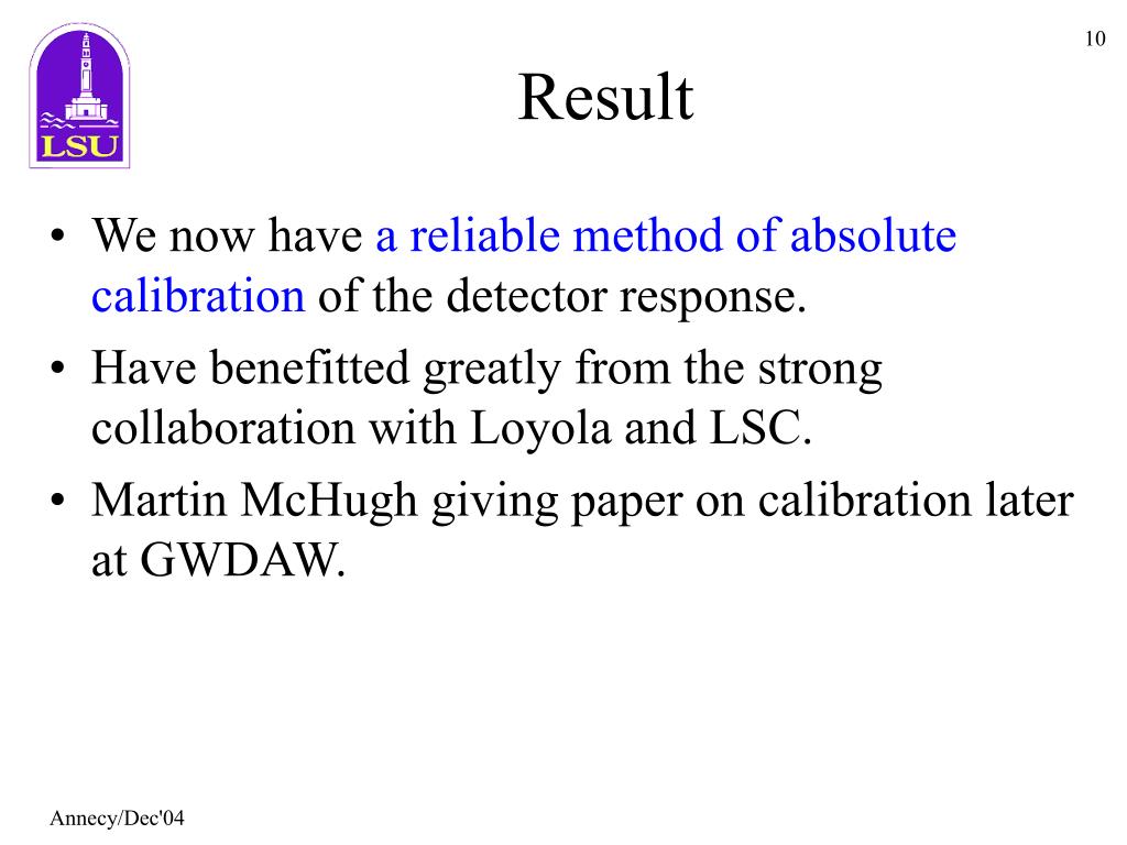 Result • We now have a reliable method of absolute calibration of the detector response. • Have benefitted greatly from the strong collaboration with Loyola and LSC. • Martin McHugh giving paper on calibration later at GWDAW. Annecy/Dec'04