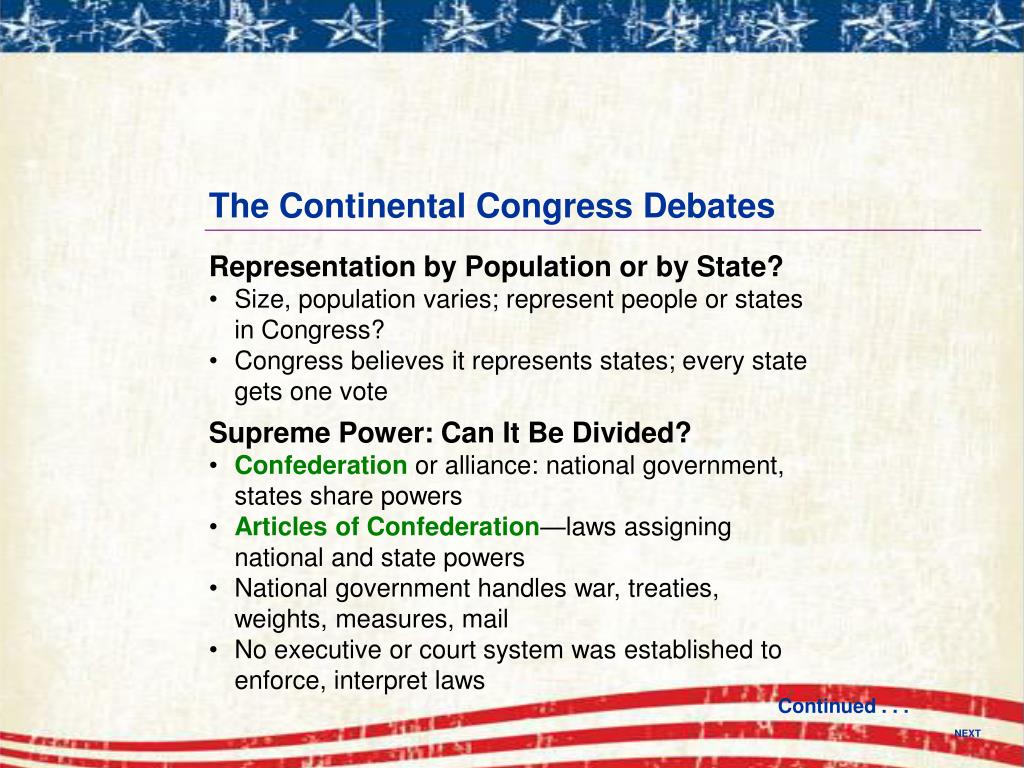 The Continental Congress Debates Representation by Population or by State? • Size, population varies; represent people or states in Congress? • Congress believes it represents states; every state gets one vote Supreme Power: Can It Be Divided? • Confederation or alliance: national government, states share powers • Articles of Confederation—laws assigning national and state powers • National government handles war, treaties, weights, measures, mail • No executive or court system was established to enforce, interpret laws Continued . . . NEXT