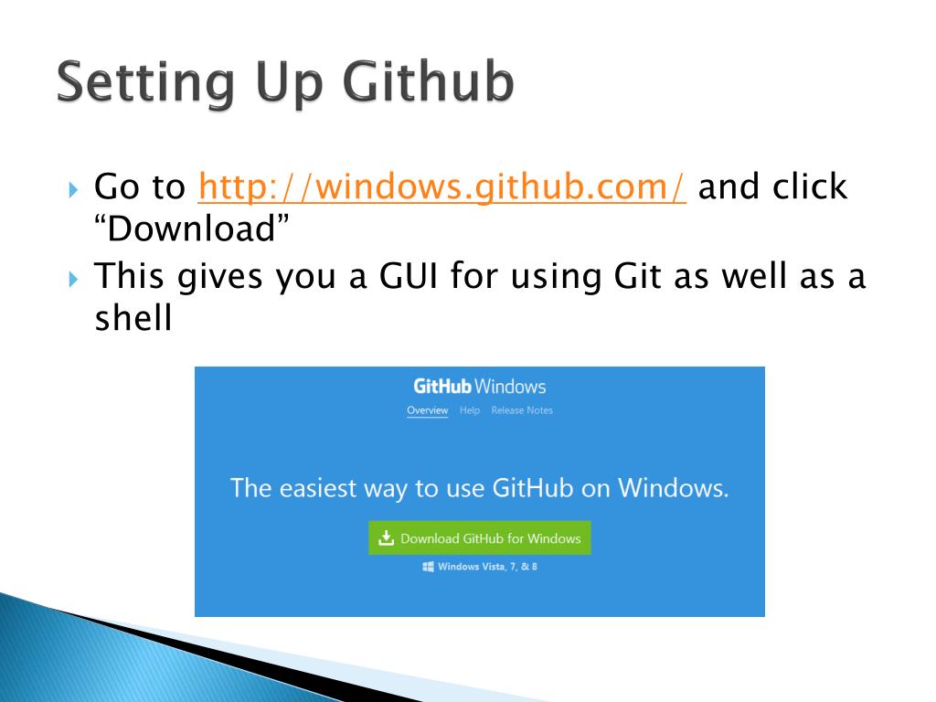 Setting Up Github • Go to http://windows.github.com/ and click “Download” • This gives you a GUI for using Git as well as a shell