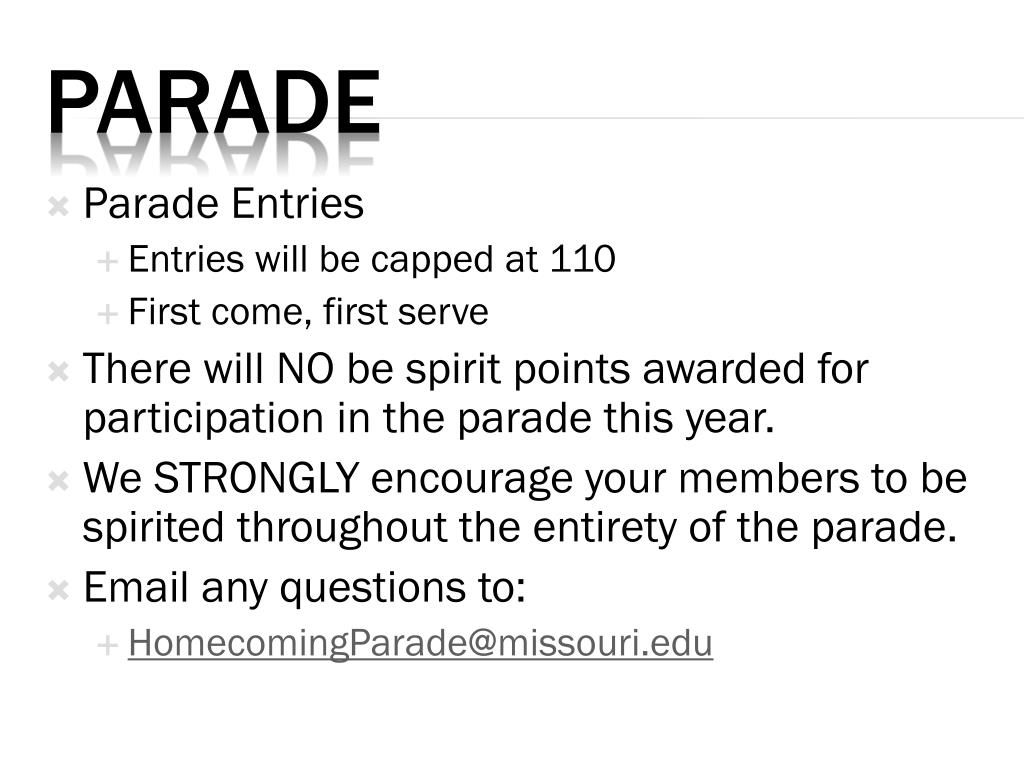 Parade Entries • Entries will be capped at 110 • First come, first serve • There will NO be spirit points awarded for participation in the parade this year. • We STRONGLY encourage your members to be spirited throughout the entirety of the parade. • Email any questions to: • HomecomingParade@missouri.edu Parade