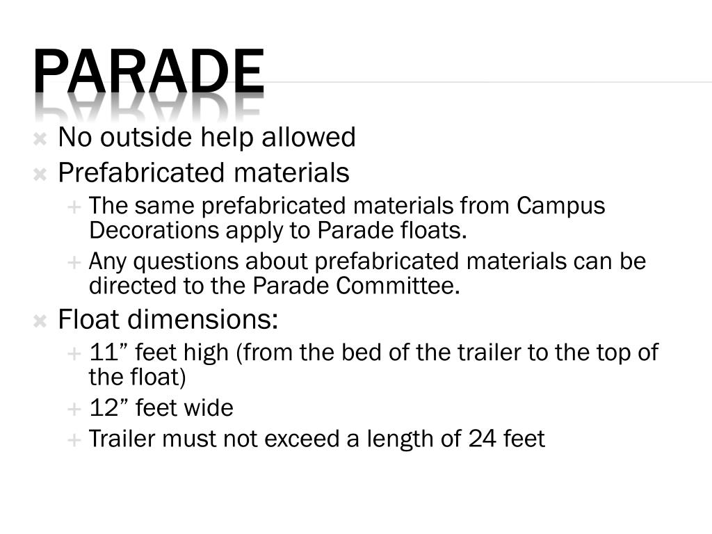 No outside help allowed • Prefabricated materials • The same prefabricated materials from Campus Decorations apply to Parade floats. • Any questions about prefabricated materials can be directed to the Parade Committee. • Float dimensions: • 11” feet high (from the bed of the trailer to the top of the float) • 12” feet wide • Trailer must not exceed a length of 24 feet Parade
