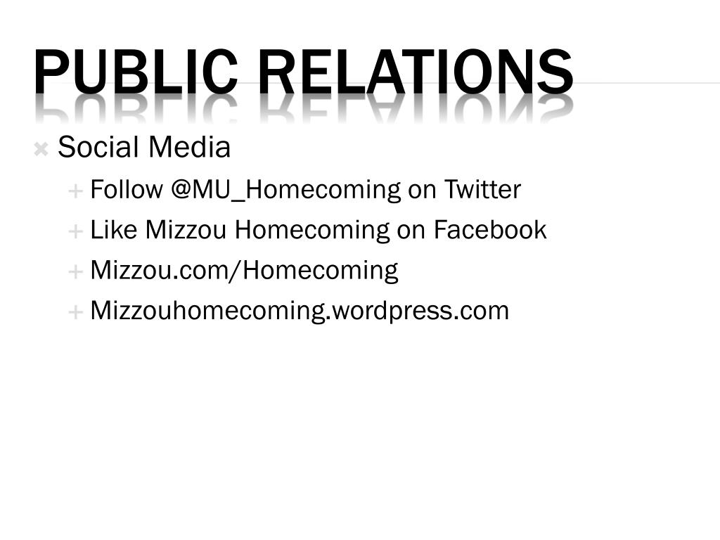Social Media • Follow @MU_Homecoming on Twitter • Like Mizzou Homecoming on Facebook • Mizzou.com/Homecoming • Mizzouhomecoming.wordpress.com Public relations