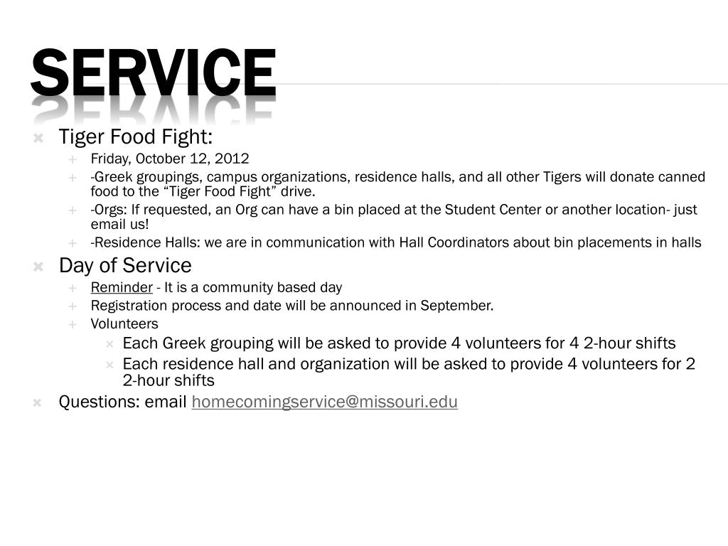 Tiger Food Fight: • Friday, October 12, 2012 • -Greek groupings, campus organizations, residence halls, and all other Tigers will donate canned food to the “Tiger Food Fight” drive. • -Orgs: If requested, an Org can have a bin placed at the Student Center or another location- just email us! • -Residence Halls: we are in communication with Hall Coordinators about bin placements in halls • Day of Service • Reminder - It is a community based day • Registration process and date will be announced in September. • Volunteers • Each Greek grouping will be asked to provide 4 volunteers for 4 2-hour shifts • Each residence hall and organization will be asked to provide 4 volunteers for 2 2-hour shifts • Questions: email homecomingservice@missouri.edu service
