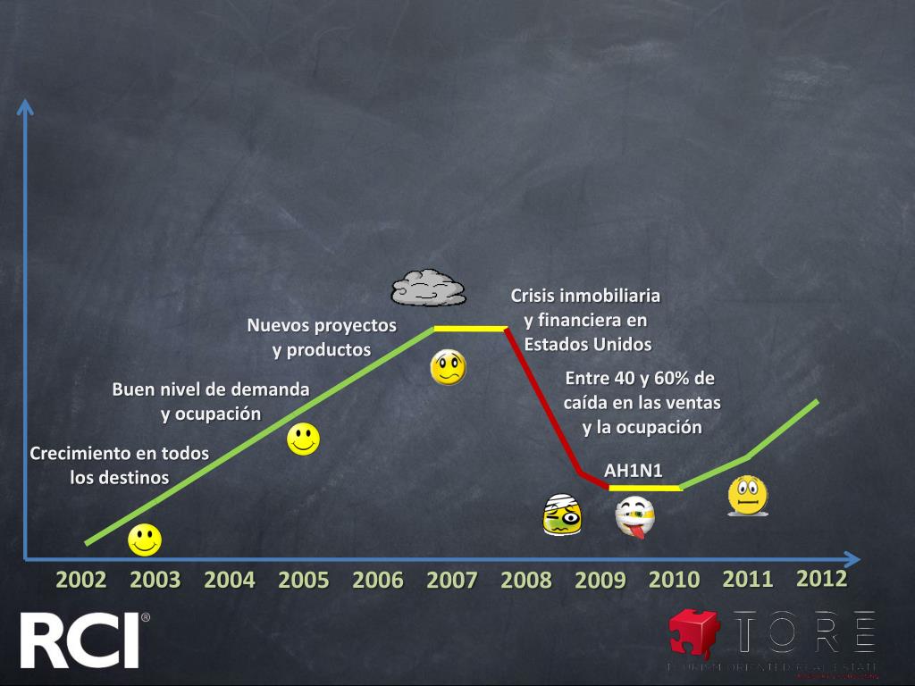 Crisis inmobiliaria y financiera en Estados Unidos Nuevos proyectos y productos Entre 40 y 60% de caída en las ventas y la ocupación Buen nivel de demanda y ocupación Crecimiento en todos los destinos AH1N1 2012 2011 2002 2003 2010 2004 2005 2006 2007 2008 2009