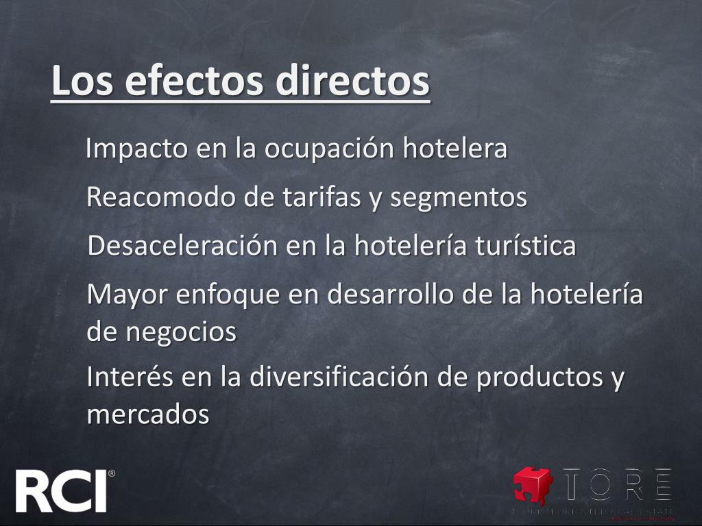 Los efectos directos Impacto en la ocupación hotelera Reacomodo de tarifas y segmentos Desaceleración en la hotelería turística Mayor enfoque en desarrollo de la hotelería de negocios Interés en la diversificación de productos y mercados