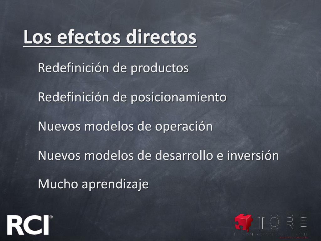 Los efectos directos Redefinición de productos Redefinición de posicionamiento Nuevos modelos de operación Nuevos modelos de desarrollo e inversión Mucho aprendizaje