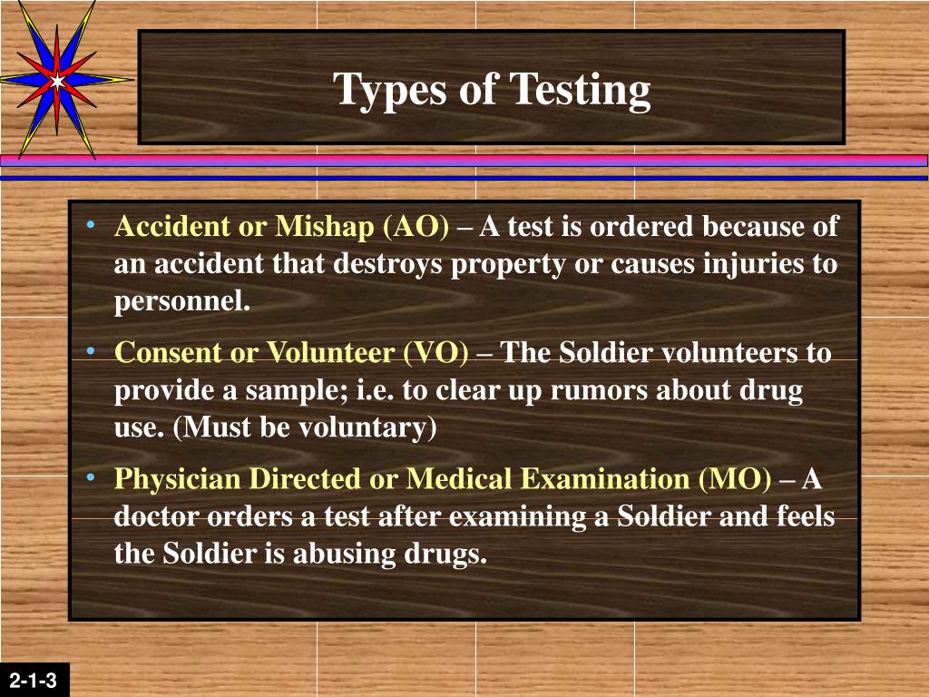 Types of Testing • Accident or Mishap (AO) – A test is ordered because of an accident that destroys property or causes injuries to personnel. • Consent or Volunteer (VO) – The Soldier volunteers to provide a sample; i.e. to clear up rumors about drug use. (Must be voluntary) • Physician Directedor Medical Examination (MO) – A doctor orders a test after examining a Soldier and feels the Soldier is abusing drugs.