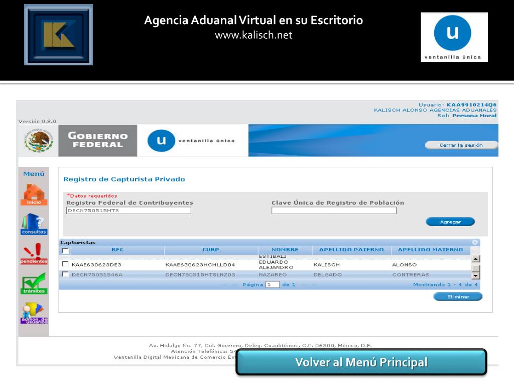 www.kalisch.net Agencia Aduanal Virtual en su Escritorio Capturista Privado Son las personas autorizadas por la Persona Moral como Capturistas Privados que Podrán realizar la captura de información y la carga de documentación digitalizada utilizando la clave de acceso que al efecto se le proporcione a través de la “Ventanilla Única” una vez que se han registrado.