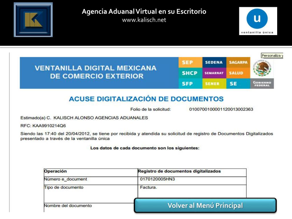 Digitalizacion de DocumentosRequisitos del Archivo Digitalizado www.kalisch.net Agencia Aduanal Virtual en su Escritorio • Debe ser formato PDF. • NO debe contener formularios, objetos OLE incrustados, código java script, etc. • El tamaño máximo del archivo es de 100MB. • No debe contener paginas en blanco. • Las imágenes contenidas deben estar en escala de grises. • La resolución debe ser de 300 dpi.