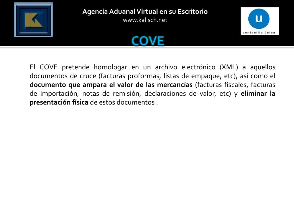 COVE www.kalisch.net Agencia Aduanal Virtual en su Escritorio El COVE pretende homologar en un archivo electrónico (XML) a aquellos documentos de cruce (facturas proformas, listas de empaque, etc), así como el documento que ampara el valor de las mercancías (facturas fiscales, facturas de importación, notas de remisión, declaraciones de valor, etc) y eliminar la presentación física de estos documentos .