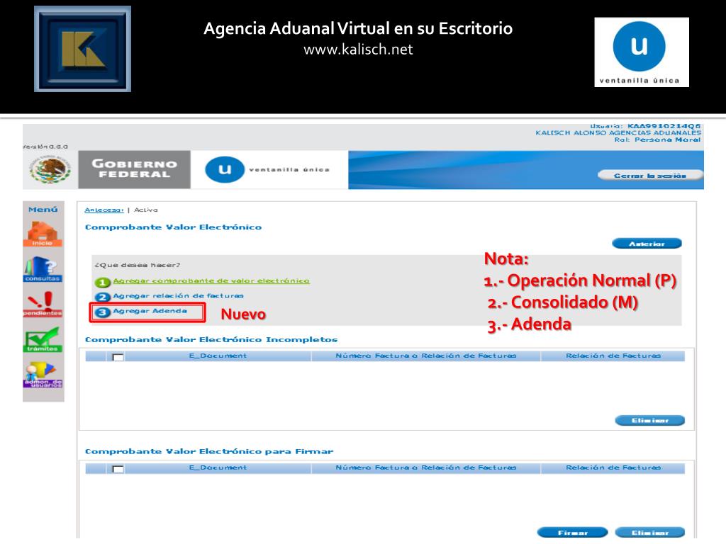 www.kalisch.net Agencia Aduanal Virtual en su Escritorio Nota: 1.- Operación Normal (P) 2.- Consolidado (M) 3.- Adenda Nuevo