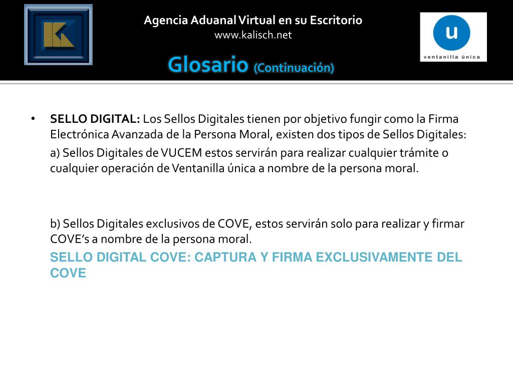 www.kalisch.net Agencia Aduanal Virtual en su Escritorio Glosario (Continuación) • SELLO DIGITAL: Los Sellos Digitales tienen por objetivo fungir como la Firma Electrónica Avanzada de la Persona Moral, existen dos tipos de Sellos Digitales: a) Sellos Digitales de VUCEM estos servirán para realizar cualquier trámite o cualquier operación de Ventanilla única a nombre de la persona moral. b) Sellos Digitales exclusivos de COVE, estos servirán solo para realizar y firmar COVE’s a nombre de la persona moral. SELLO DIGITAL COVE: CAPTURA Y FIRMA EXCLUSIVAMENTE DEL COVE