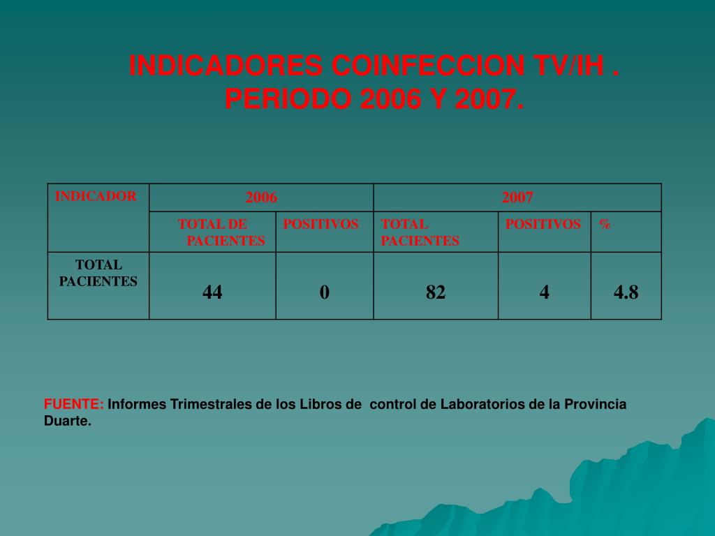 INDICADORES COINFECCION TV/IH . PERIODO 2006 Y 2007. FUENTE:Informes Trimestrales de los Libros de control de Laboratorios de la Provincia Duarte.