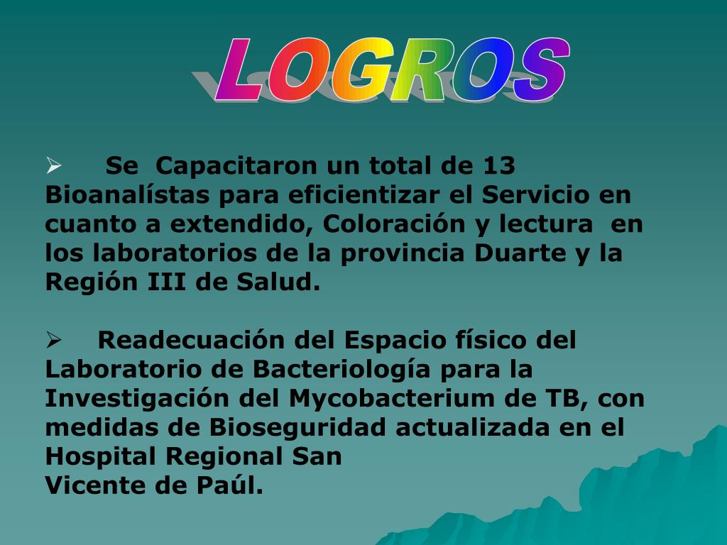 LOGROS • Se Capacitaron un total de 13 Bioanalístas para eficientizar el Servicio en cuanto a extendido, Coloración y lectura en los laboratorios de la provincia Duarte y la Región III de Salud. • Readecuación del Espacio físico del Laboratorio de Bacteriología para la Investigación del Mycobacterium de TB, con medidas de Bioseguridad actualizada en el Hospital Regional San • Vicente de Paúl.