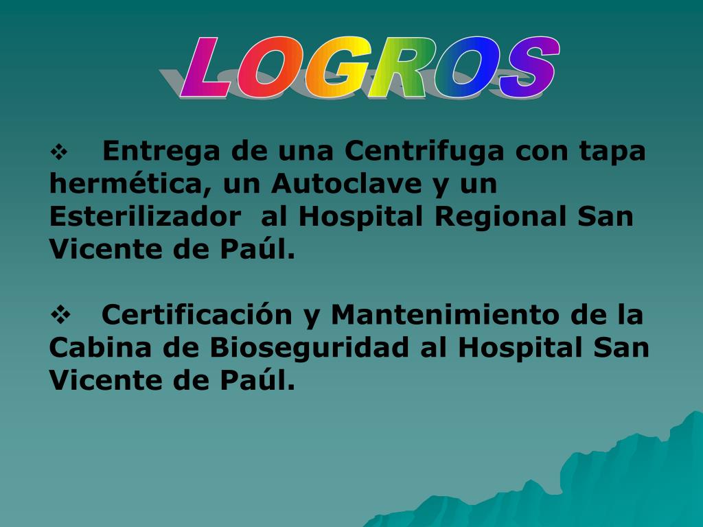 LOGROS • Entrega de una Centrifuga con tapa hermética, un Autoclave y un Esterilizador al Hospital Regional San Vicente de Paúl. • Certificación y Mantenimiento de la Cabina de Bioseguridad al Hospital San Vicente de Paúl.