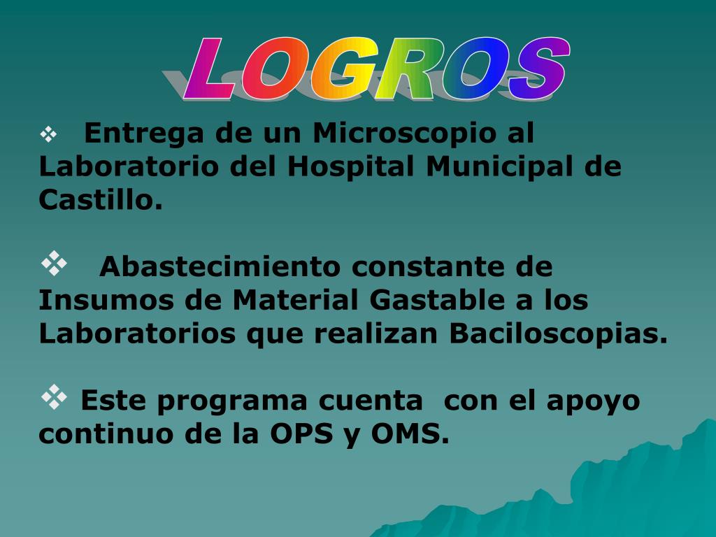 LOGROS • Entrega de un Microscopio al Laboratorio del Hospital Municipal de Castillo. • Abastecimiento constante de Insumos de Material Gastable a los Laboratorios que realizan Baciloscopias. • Este programa cuenta con el apoyo continuo de la OPS y OMS.
