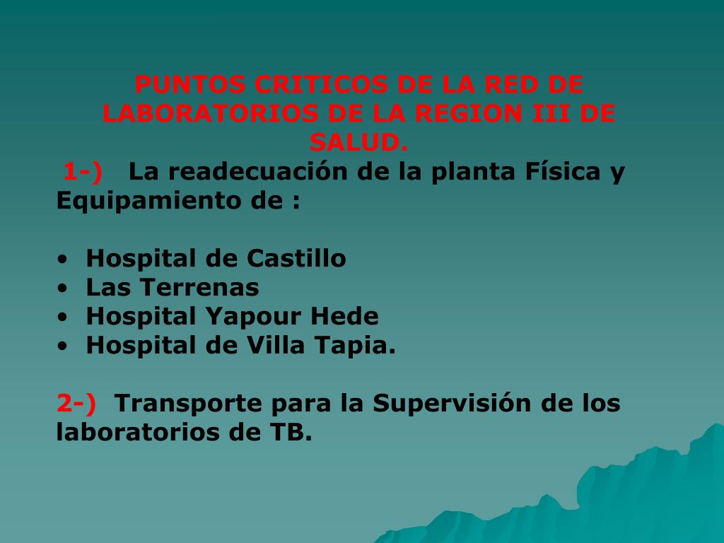 PUNTOS CRITICOS DE LA RED DE LABORATORIOS DE LA REGION III DE SALUD. • 1-)La readecuación de la planta Física y Equipamiento de : • Hospital de Castillo • Las Terrenas • Hospital Yapour Hede • Hospital de Villa Tapia. • 2-)Transporte para la Supervisión de los laboratorios de TB.
