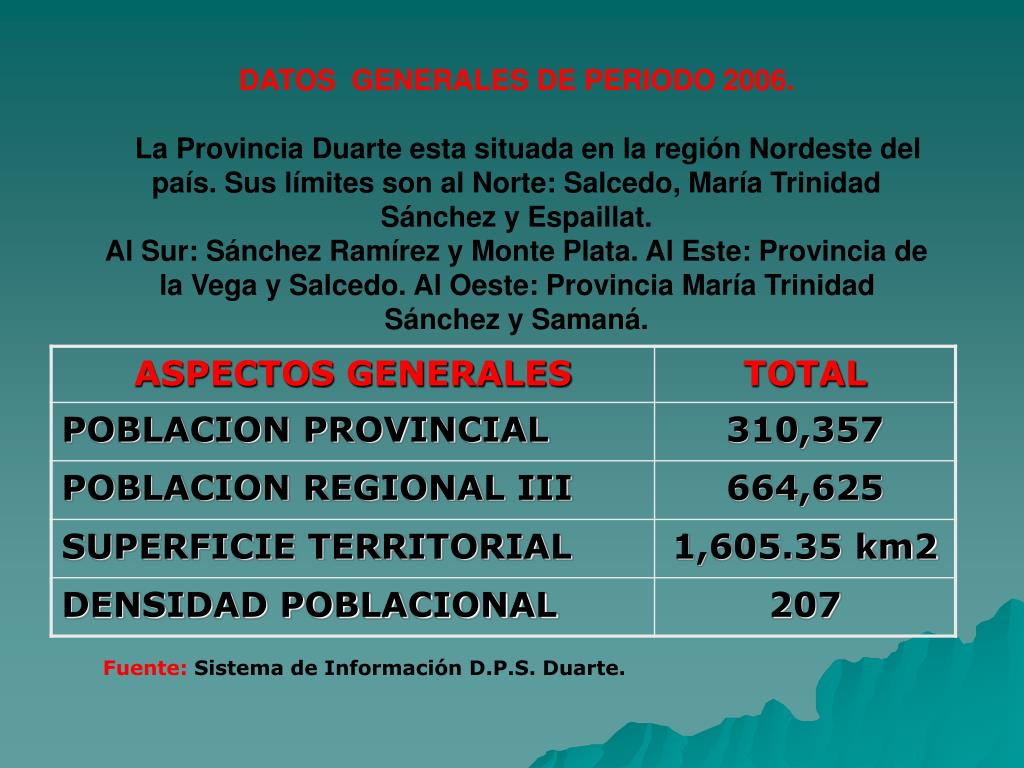 DATOS GENERALES DE PERIODO 2006. La Provincia Duarte esta situada en la región Nordeste del país. Sus límites son al Norte: Salcedo, María Trinidad Sánchez y Espaillat. Al Sur: Sánchez Ramírez y Monte Plata. Al Este: Provincia de la Vega y Salcedo. Al Oeste: Provincia María Trinidad Sánchez y Samaná. Fuente:Sistema de Información D.P.S. Duarte.