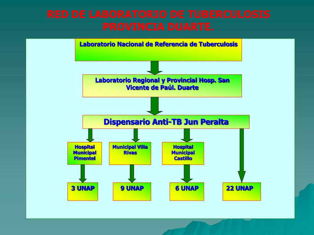 Laboratorio Nacional de Referencia de Tuberculosis Laboratorio Regional y Provincial Hosp. San Vicente de Paúl. Duarte Dispensario Anti-TB Jun Peralta Hospital Municipal Pimentel Municipal Villa Rivas Hospital Municipal Castillo 3 UNAP 9 UNAP 6 UNAP 22 UNAP REDDE LABORATORIO DE TUBERCULOSIS PROVINCIA DUARTE.