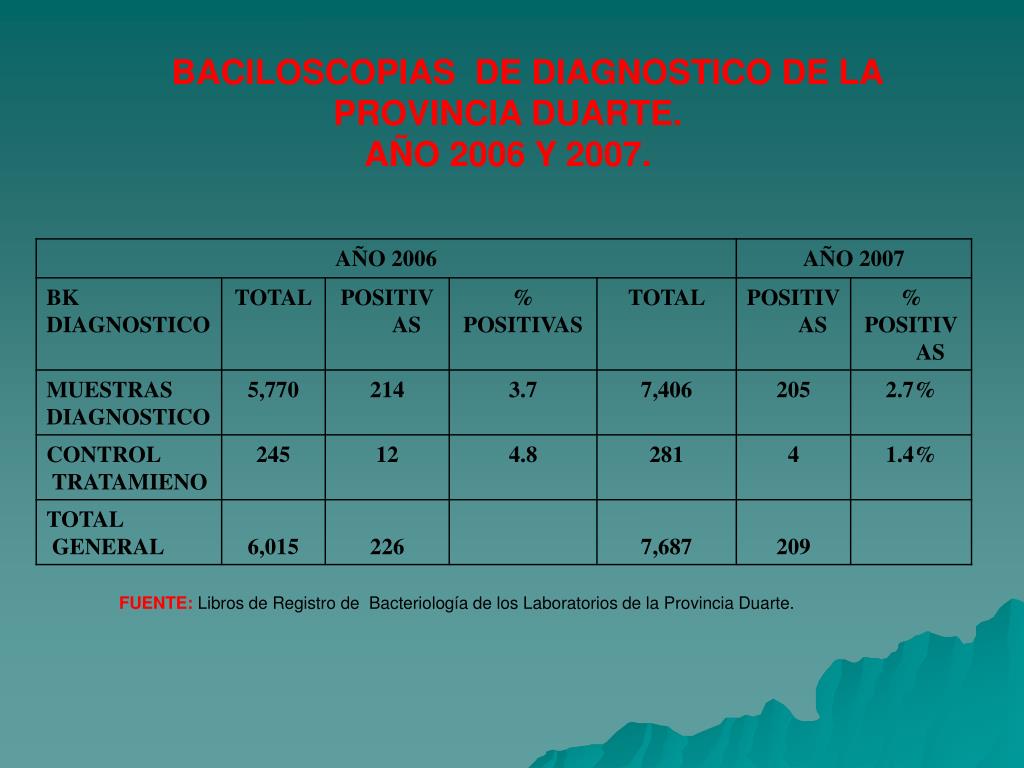 BACILOSCOPIAS DE DIAGNOSTICO DE LA PROVINCIA DUARTE. AÑO 2006 Y 2007. FUENTE:Libros de Registrode Bacteriología de los Laboratorios de la Provincia Duarte.