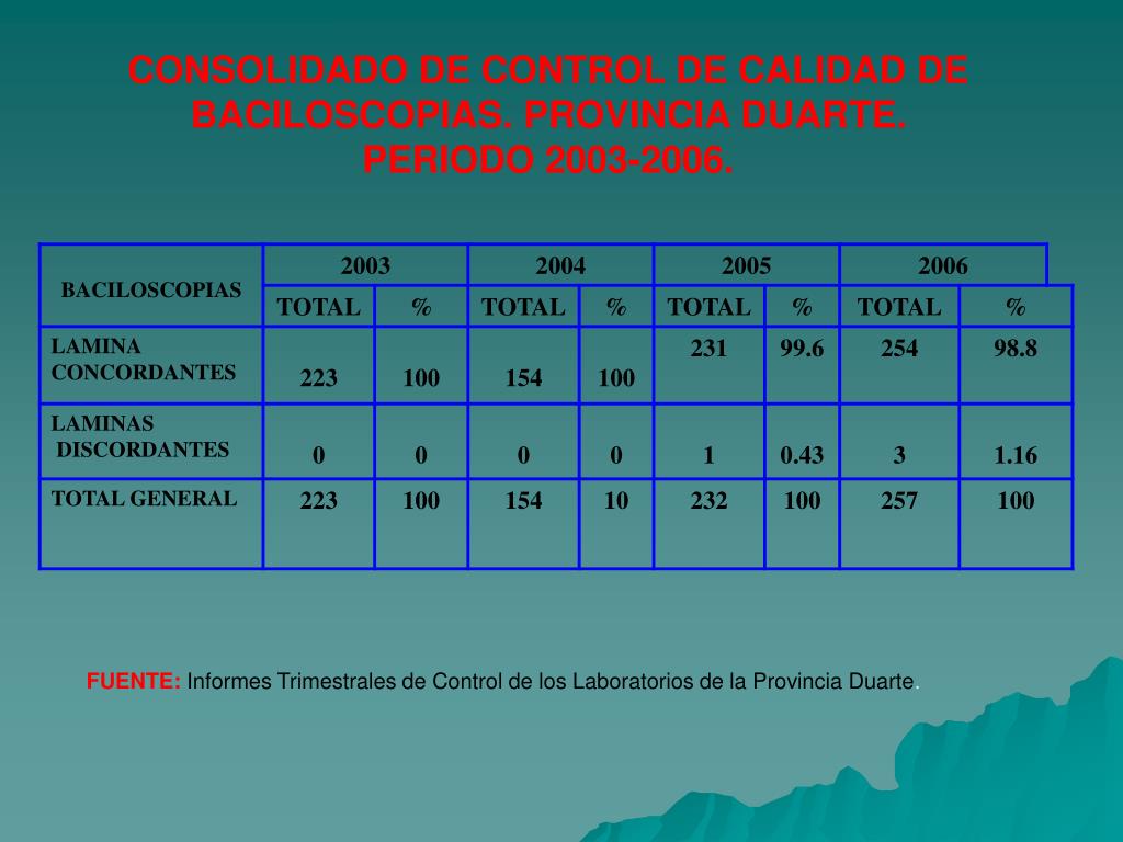 CONSOLIDADO DE CONTROL DE CALIDAD DE BACILOSCOPIAS. PROVINCIA DUARTE. PERIODO 2003-2006. FUENTE:Informes Trimestrales de Control de los Laboratorios de la Provincia Duarte.