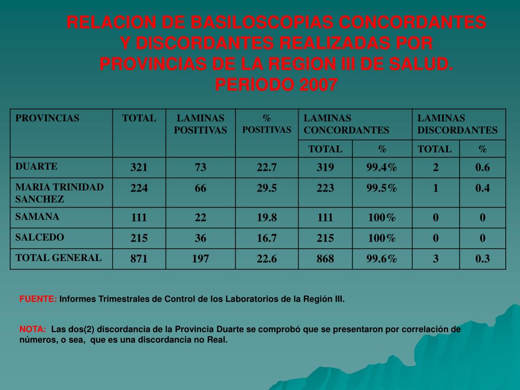 RELACION DE BASILOSCOPIAS CONCORDANTES Y DISCORDANTES REALIZADAS POR PROVINCIAS DE LA REGION III DE SALUD. PERIODO 2007 FUENTE:Informes Trimestrales de Control de los Laboratorios de la Región III. NOTA:Las dos(2) discordancia de la ProvinciaDuarte se comprobó que se presentaron por correlación de números, o sea, que es una discordancia no Real.