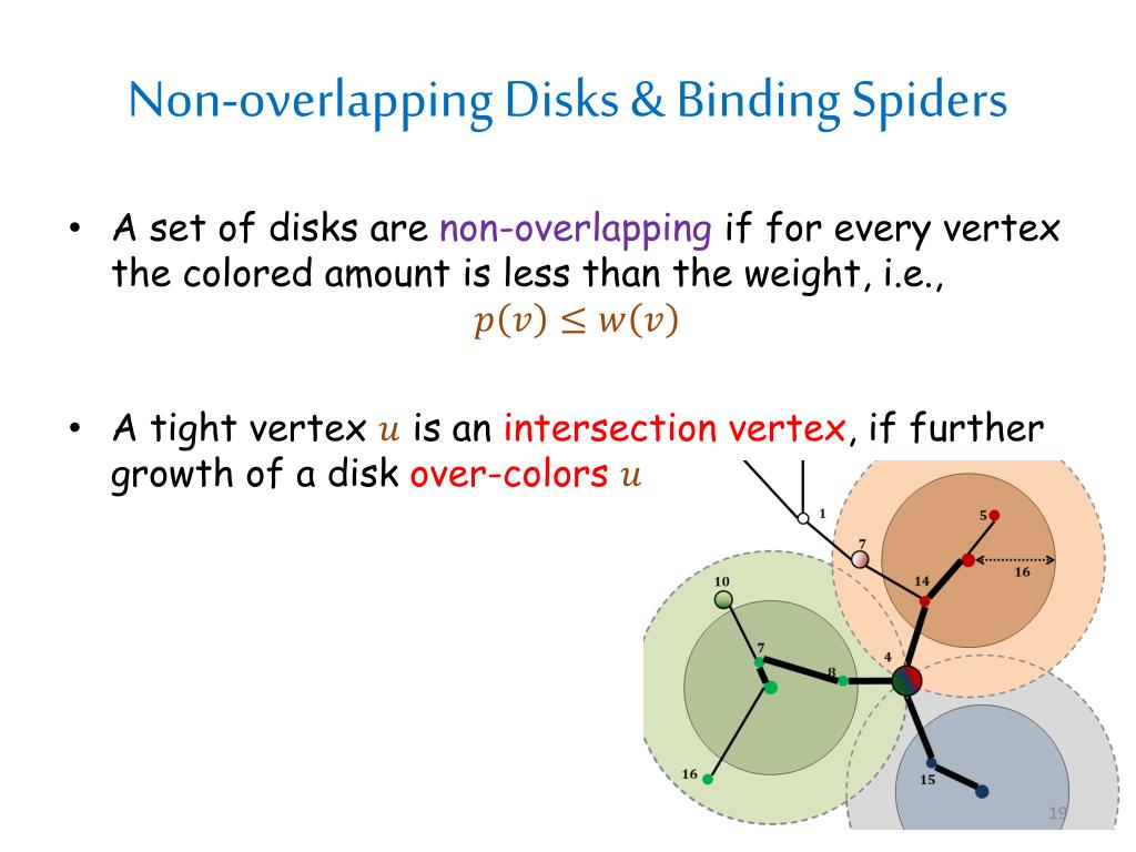 Non-overlapping Disks & Binding Spiders • A set of disks are non-overlappingif for every vertex the colored amount is less than the weight, i.e., • A tight vertex is an intersection vertex, if further growth of a disk over-colors