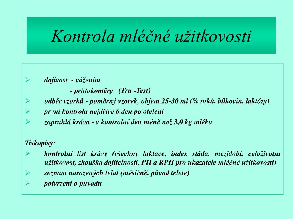 Kontrola mléčné užitkovosti • dojivost - vážením - průtokoměry (Tru -Test) • odběr vzorků - poměrný vzorek, objem 25-30 ml (% tuků, bílkovin, laktózy) • první kontrola nejdříve 6.den po otelení • zaprahlá kráva - v kontrolní den méně než 3,0 kg mléka Tiskopisy: • kontrolní list krávy (všechny laktace, index stáda, mezidobí,celoživotní užitkovost, zkouška dojitelnosti, PH aRPH pro ukazatele mléčné užitkovosti) • seznam narozených telat (měsíčně, původ telete) • potvrzení o původu