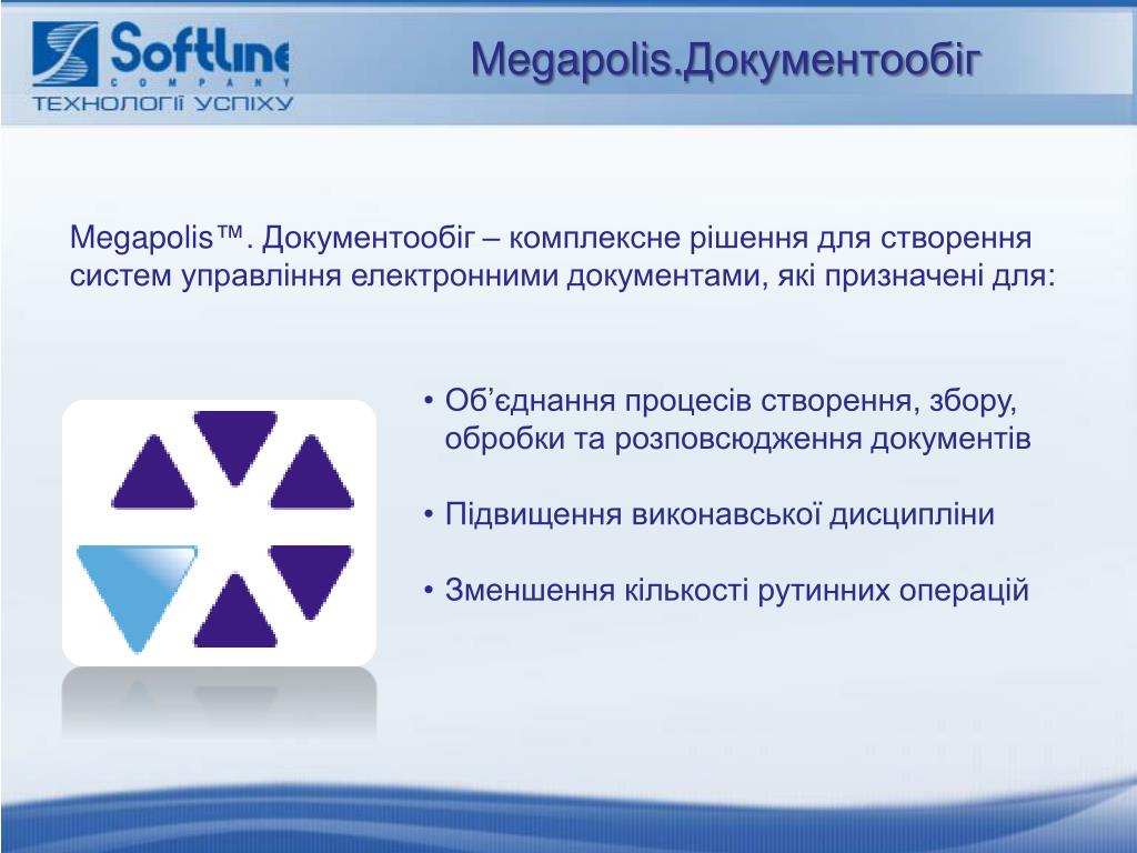 Megapolis.Документообіг Megapolis™. Документообіг – комплексне рішення для створення систем управління електронними документами, які призначені для: • Об’єднання процесів створення, збору, обробки та розповсюдження документів • Підвищення виконавської дисципліни • Зменшення кількості рутинних операцій