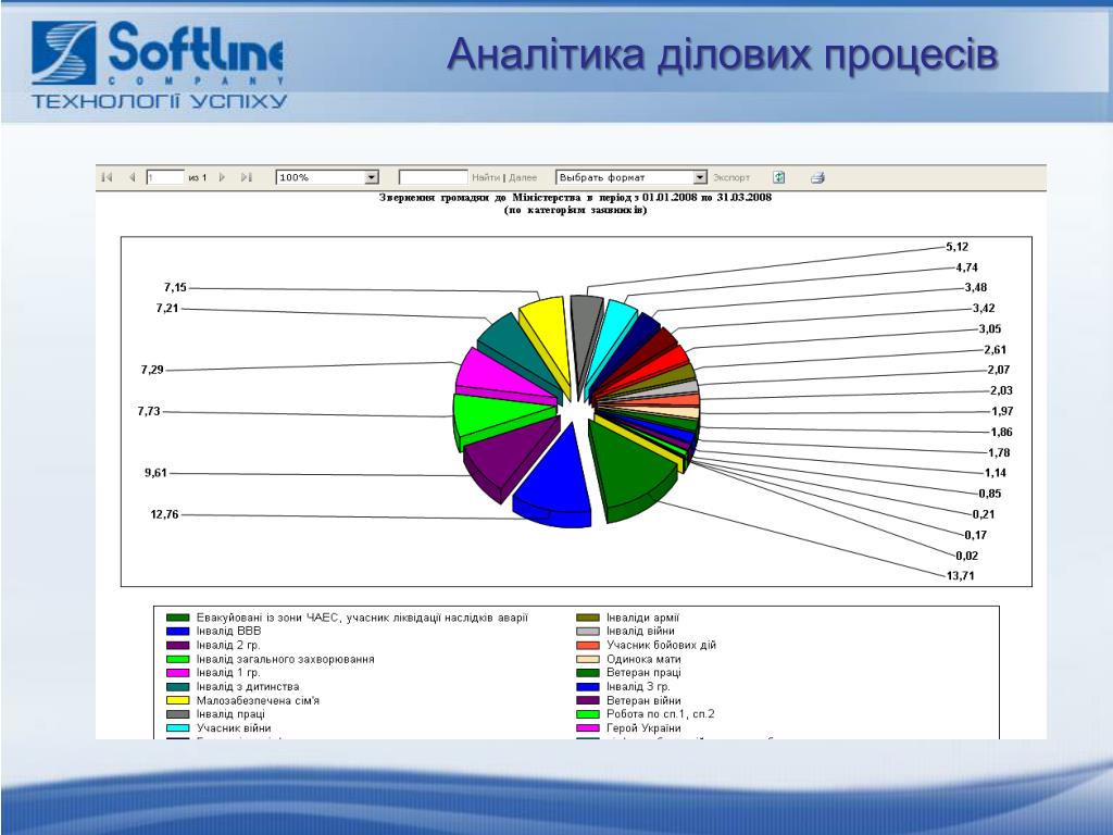 Аналітика ділових процесів • В системі Megapolis. Документообіг реалізована інтеграція з платформою аналізу ділових процесів Microsoft Reporting Services, яка дозволяє створювати зручне відображення аналітичної інформації для прийняття рішень.