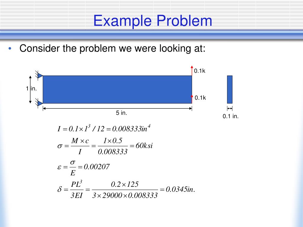 Example Problem • Consider the problem we were looking at: 1k 1 in. 1k 5 in. 0.1 in.