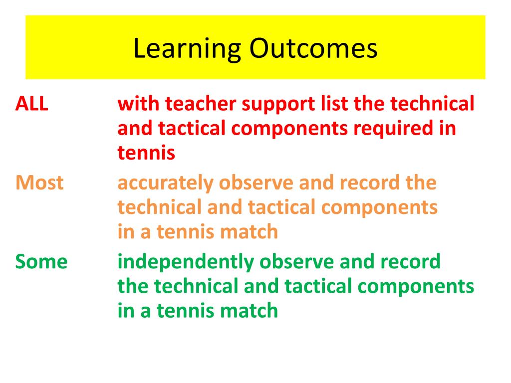 Learning Outcomes ALL with teacher support list the technical and tactical components required in tennis Most accurately observe and record the technical and tactical components in a tennis match Some independently observe and record the technical and tactical components in a tennis match