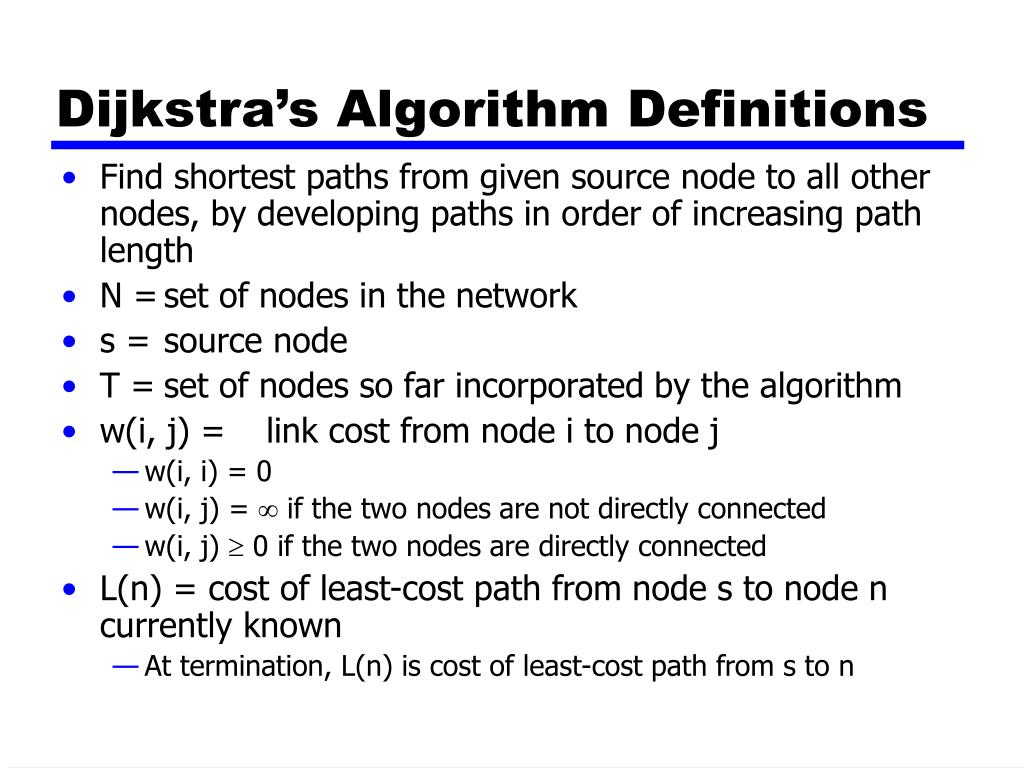 Dijkstra’s Algorithm Definitions • Find shortest paths from given source node to all other nodes, by developing paths in order of increasing path length • N= set of nodes in the network • s = source node • T= set of nodes so far incorporated by the algorithm • w(i, j)= link cost from node i to node j • w(i, i) = 0 • w(i, j) = if the two nodes are not directly connected • w(i, j) 0 if the two nodes are directly connected • L(n)=cost of least-cost path from node s to node n currently known • At termination, L(n) is cost of least-cost path from s to n