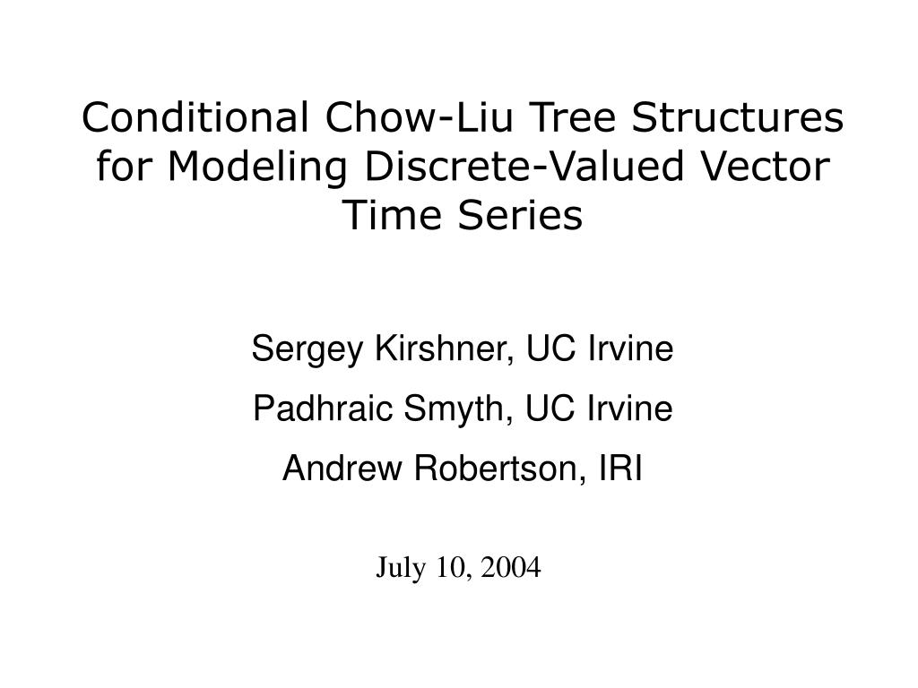 Conditional Chow-Liu Tree Structures for Modeling Discrete-Valued Vector Time Series Sergey Kirshner, UC Irvine Padhraic Smyth, UC Irvine Andrew Robertson, IRI July 10, 2004