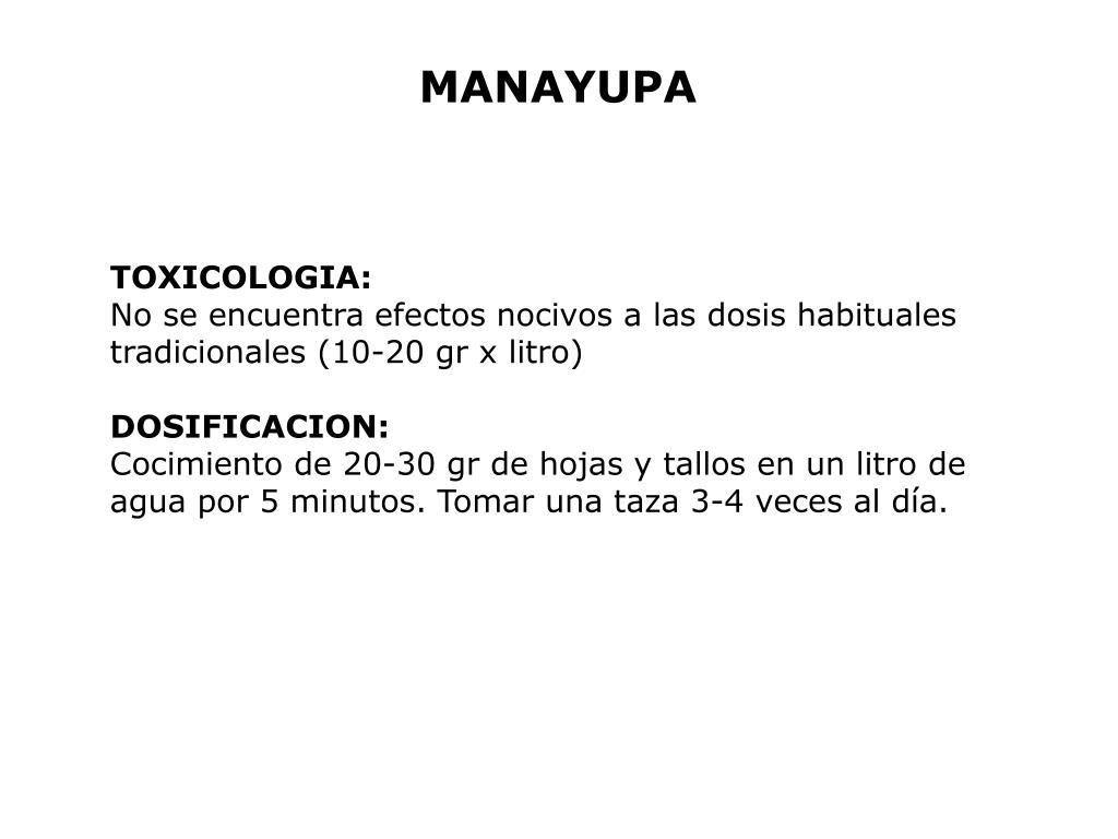 MANAYUPA TOXICOLOGIA: No se encuentra efectos nocivos a las dosis habituales tradicionales (10-20 gr x litro) DOSIFICACION: Cocimiento de 20-30 gr de hojas y tallos en un litro de agua por 5 minutos. Tomar una taza 3-4 veces al día.