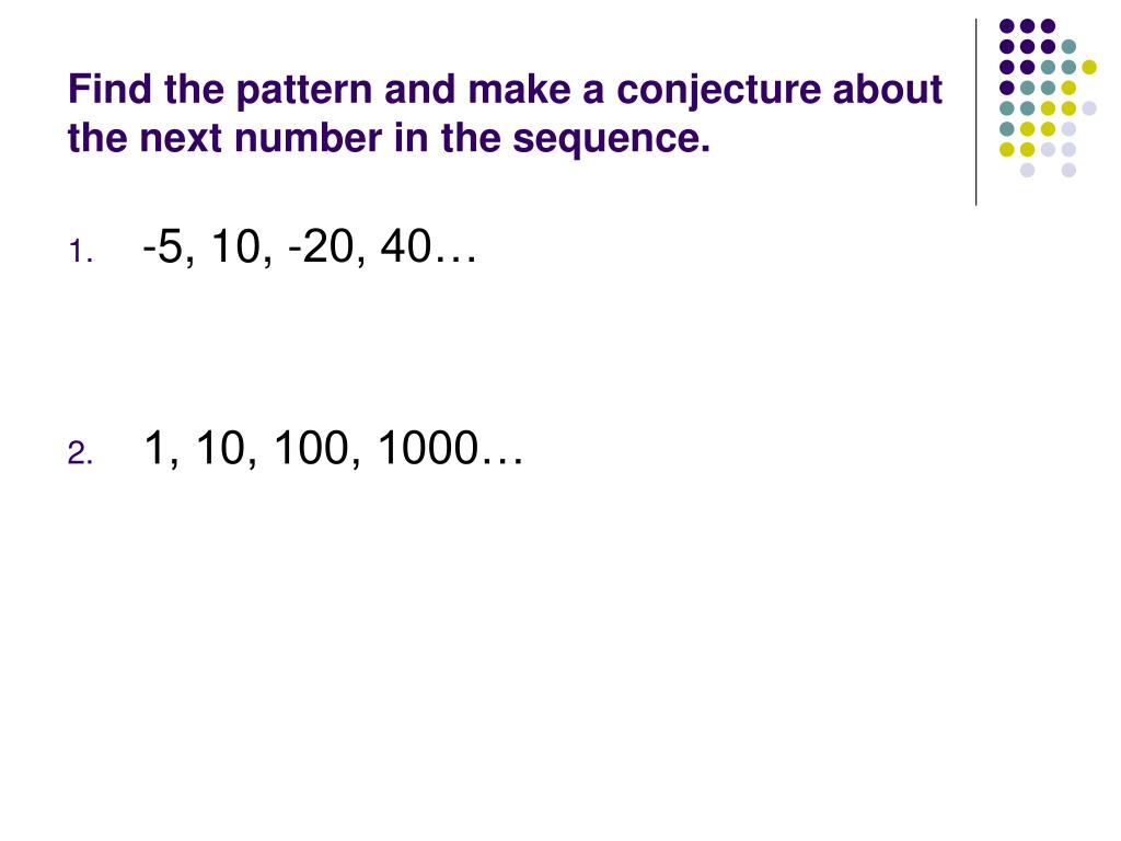 Find the pattern and make a conjecture about the next number in the sequence. • -5, 10, -20, 40… • 1, 10, 100, 1000…