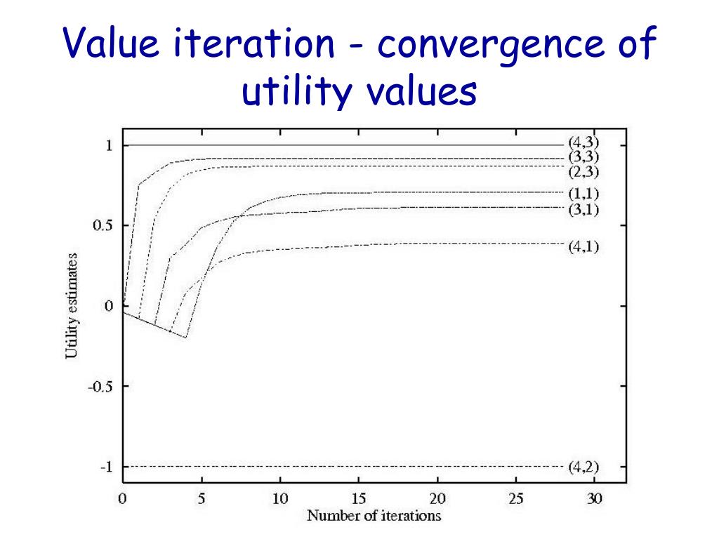 Value iteration function Value-Iteration(MDP) returns a utility function inputs: P(Si |Sj,a), a transition model R, a reward function on states discount parameter local variables: Utility function, initially identical to R U’, utility function, initially identical to R repeat U U’ for each stateido U’ [Si] R [Si] + maxajP(Sj |Si,a) U(Sj) end until Close-Enough(U,U’) return U