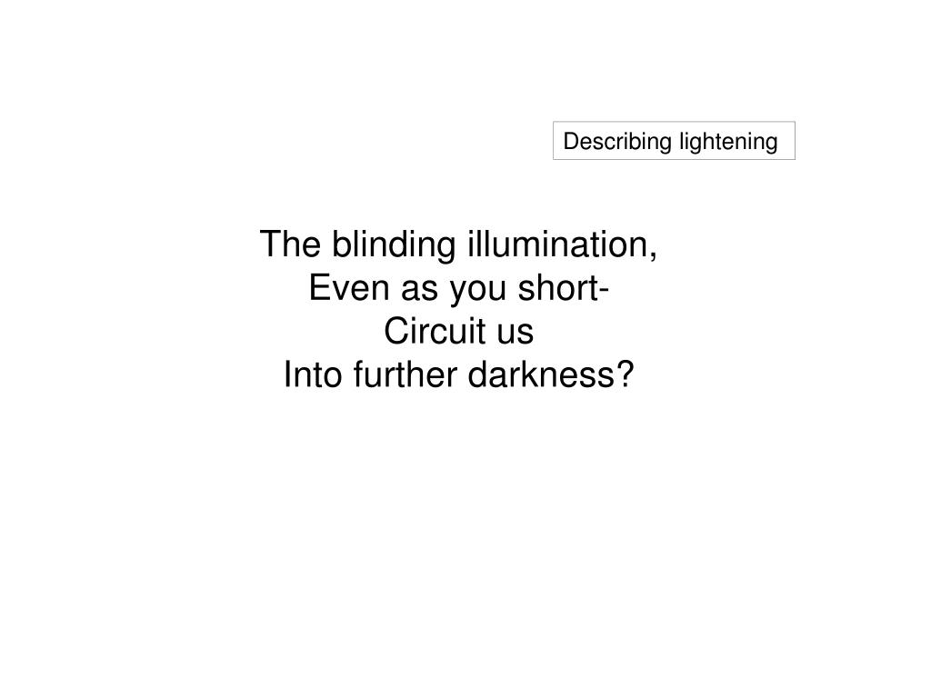 The blinding illumination,Even as you short-Circuit usInto further darkness? Describing lightening