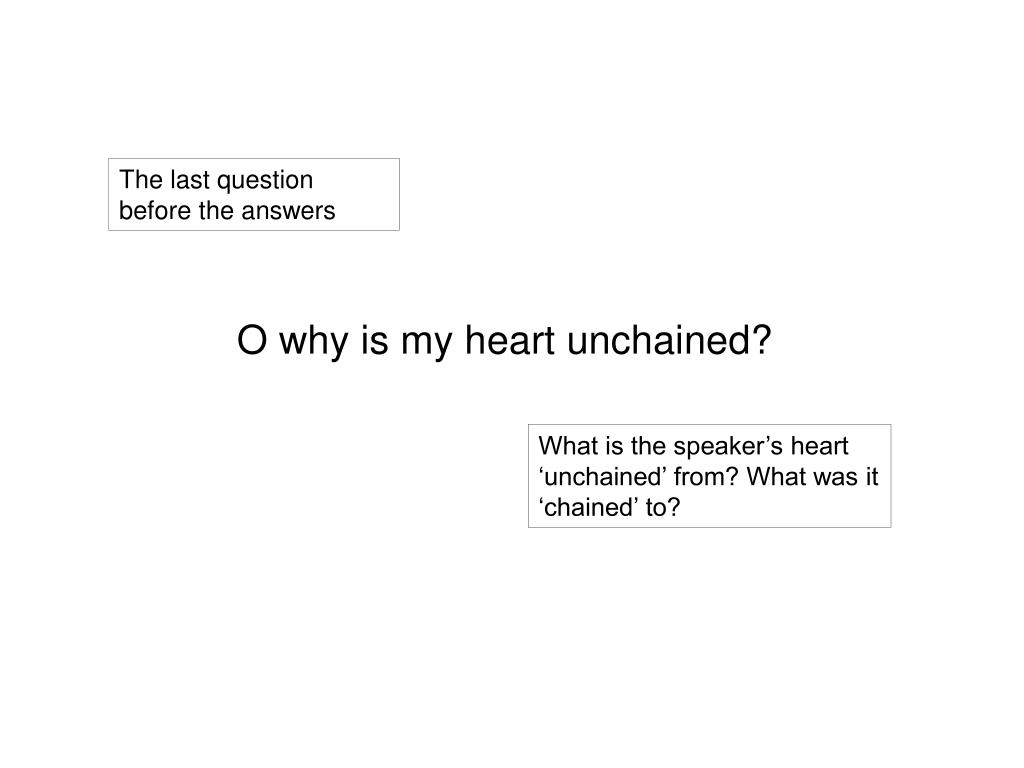 O why is my heart unchained? The last question before the answers What is the speaker’s heart ‘unchained’ from? What was it ‘chained’ to?