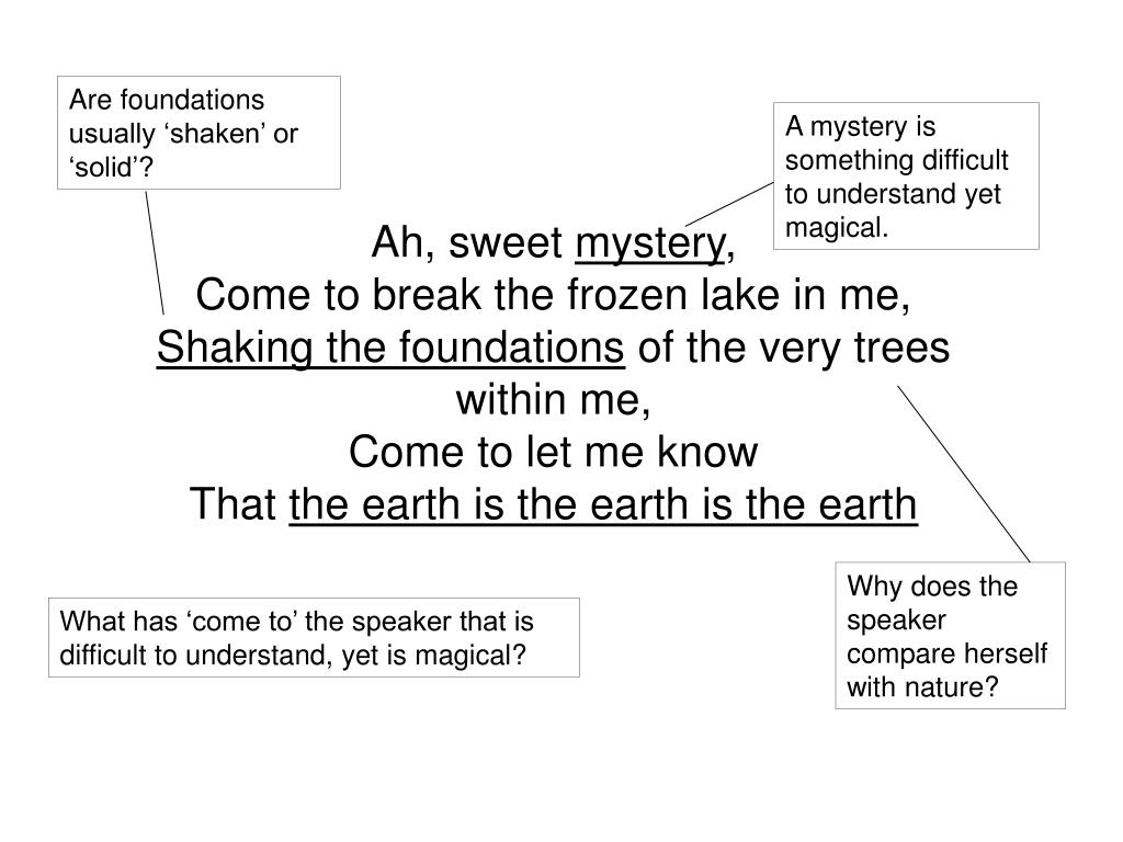 Are foundations usually ‘shaken’ or ‘solid’? Ah, sweet mystery,Come to break the frozen lake in me,Shaking the foundations of the very trees within me,Come to let me knowThat the earth is the earth is the earth A mystery is something difficult to understand yet magical. Why does the speaker compare herself with nature? What has ‘come to’ the speaker that is difficult to understand, yet is magical?