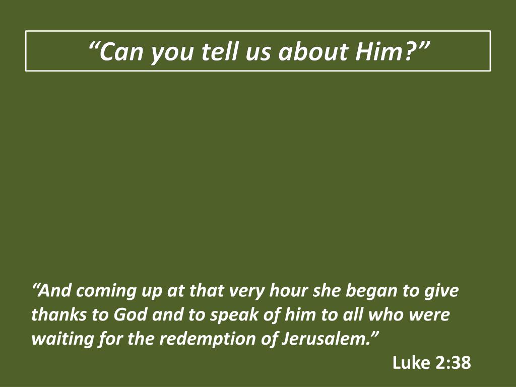 “Can you tell us about Him?” “And coming up at that very hourshe began to give thanks to God and to speak of him to all who were waiting for the redemption of Jerusalem.” Luke 2:38