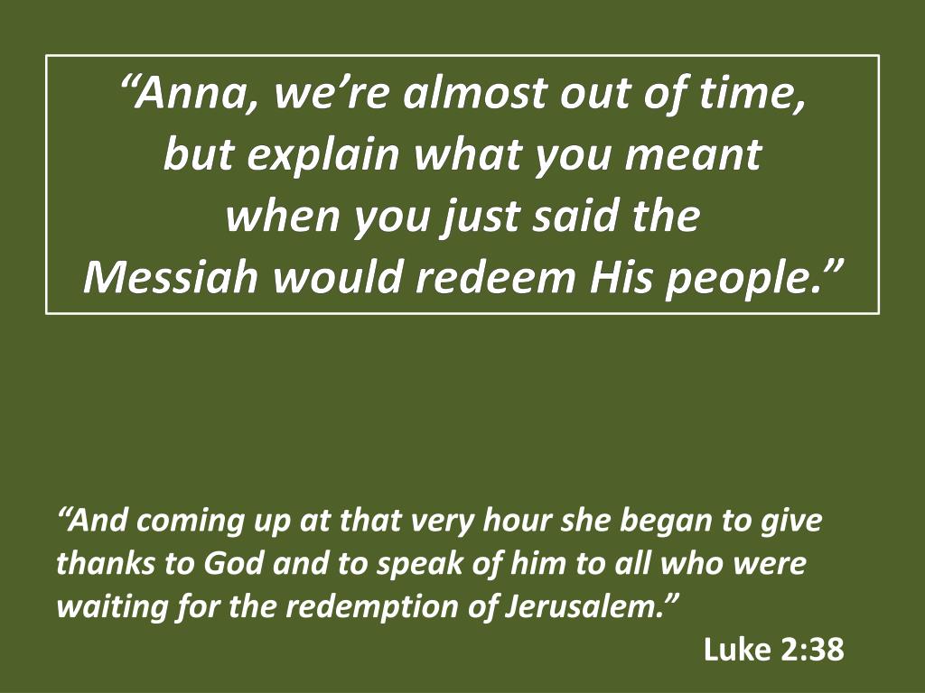 “Anna, we’re almost out of time, but explain what you meant when you just said the Messiah would redeem His people.” “And coming up at that very hourshe began to give thanks to God and to speak of him to all who were waiting for the redemption of Jerusalem.” Luke 2:38