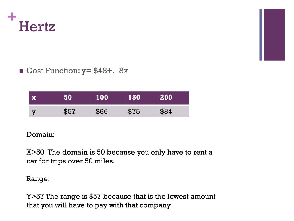 Hertz • Cost Function: y= $48+.18x Domain: X>50 The domain is 50 because you only have to rent a car for trips over 50 miles. Range: Y>57 The range is $57 because that is the lowest amount that you will have to pay with that company.
