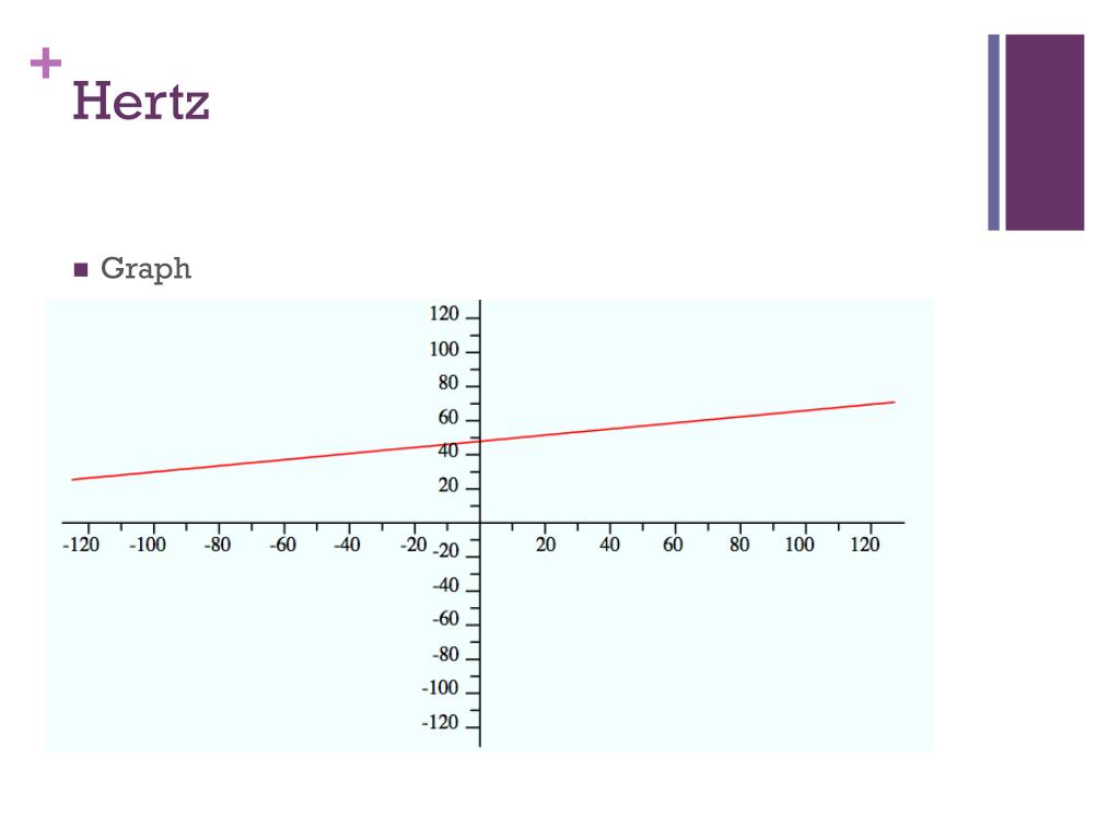 Hertz • Intercepts: • X intercept: -266.6 • Y Intercept: $48 Y is $48 at 0 miles. • Slope: 9/50 • This means that for every 50 miles you travel you have to pay $9.